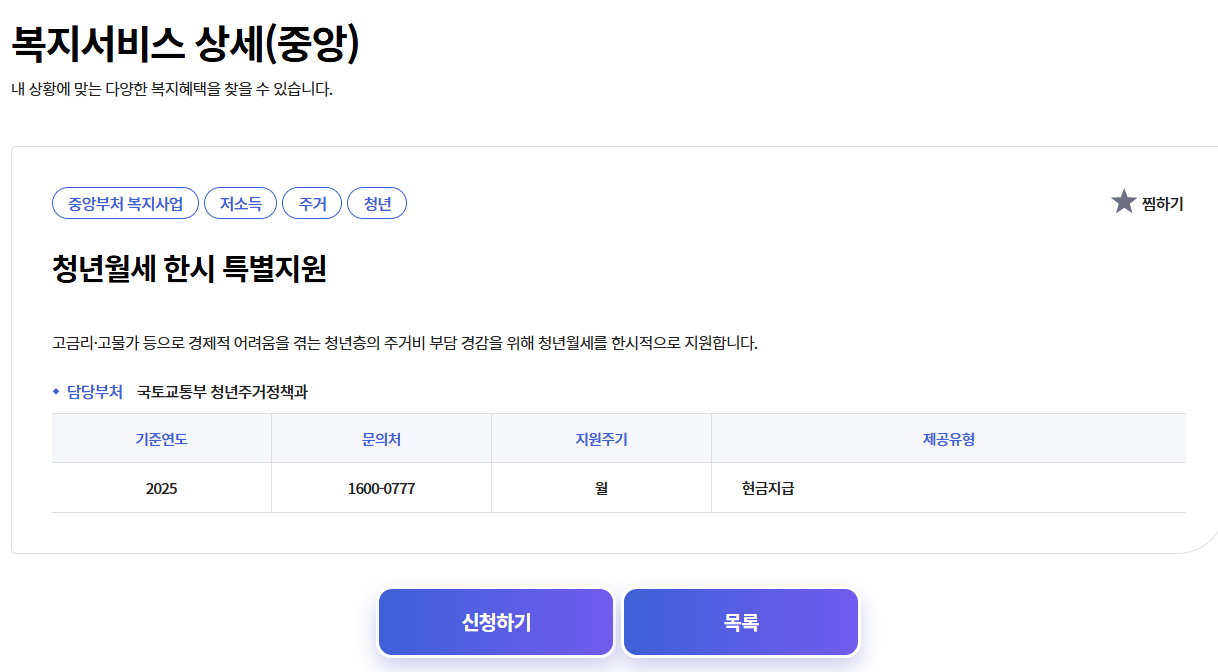 - 📌 복지로 신청 : 복지로 로그인 > 복지서비스 신청 > 복지급여 신청 > 기타 > 청년월세 한시 특별지원