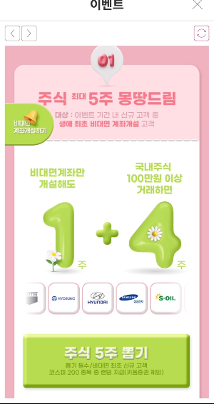 키움증권은 생애 최초 비대면 계좌개설한 고객에게 주식 최대 5주를 주는 이벤트를 하고 있네요. 중개형 ISA 계좌 개설하는 고객은 현금 지원도 있습니다. 요즘 증권사들이 고객유치를 위해 이벤트를 많이 하네요.