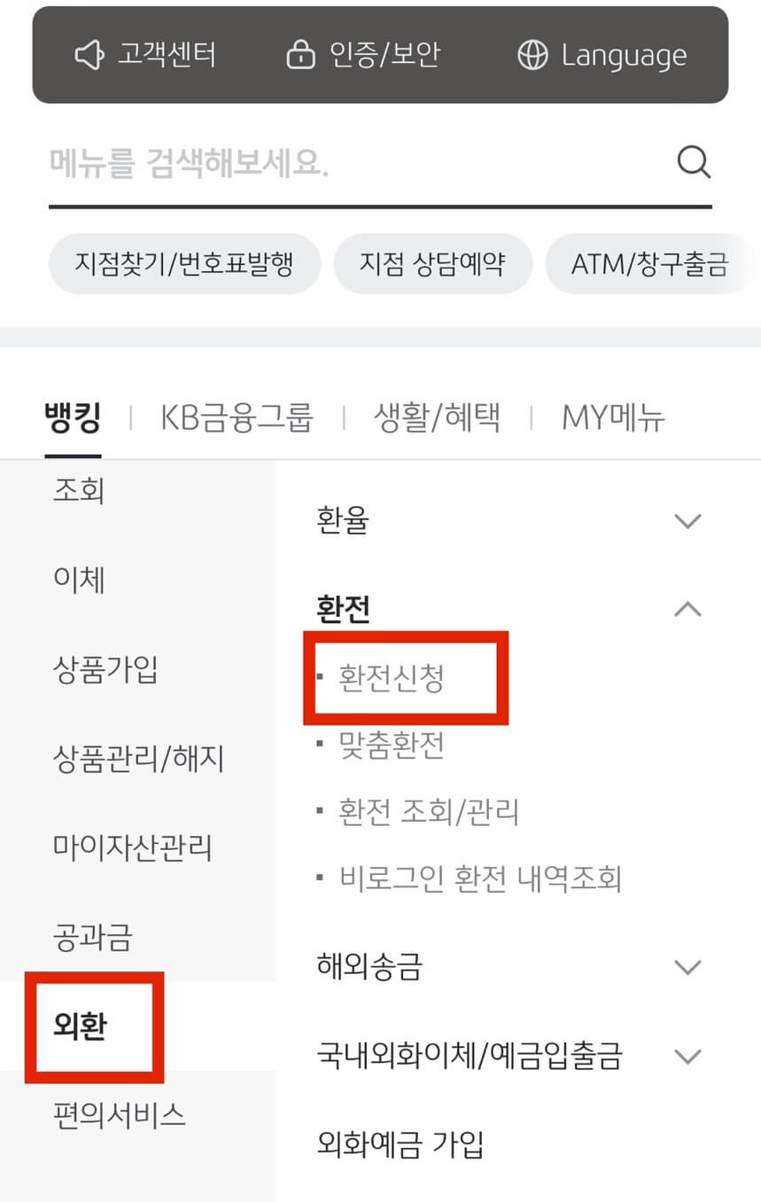 'kb스타뱅킹' 앱 - 우측 상단 줄 3 개 - 뱅킹 - 외환 - 환전 - 환전 신청