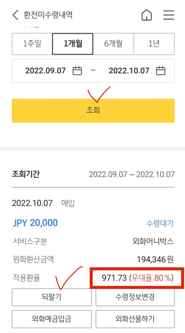 환전 미수령 내역 - 조회 - 되팔기 신청
