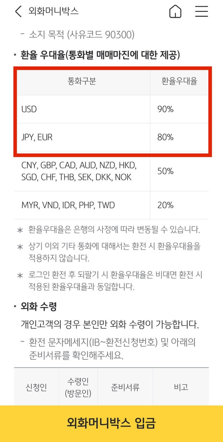 환율우대율 확인하고 하단에 '외화머니박스 입금'선택